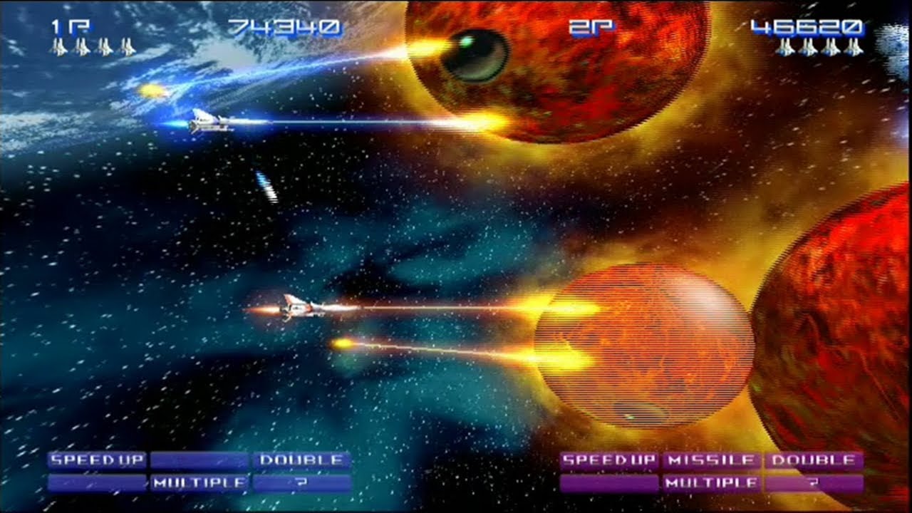 Há uns anos eu comprei um PS3 que roda jogos de PS2 só para jogar minha cópia de Gradius V, já que o leitor do meu PS2 havia estragado, mas hoje em dia não é mais necessário conseguir um aparelho antigo ou raro para rodar este jogo: Gradius V foi oficialmente lançado para PS3, e adivinhem? Ficou fantástico! É o mesmo jogo, não implementaram nada de novo, mas é impressionante como fica lindo jogá-lo em HDMI. Ele é um jogo da sessão PS2 Classics da PSN, e como todo jogo desta categoria, ele vem com algumas opções pré-definidas assim que vc o compra. Minha dica é: Coloque em formato 4:3 (que é o formato original do jogo, senão fica tudo achatado). Você vai acabar perdendo um pequena faixa lateral nos cantos direito e esquerdo da tela, mas o jogo em 16:9 fica horroroso, esticado, e ridículo. Também recomendo desligar o filtro de vídeo e jogar com os gráficos originais, que ficam cristalinos, limpos, e mostram tudo o que o artista quis desenhar nas TVs modernas, sem perder nada.